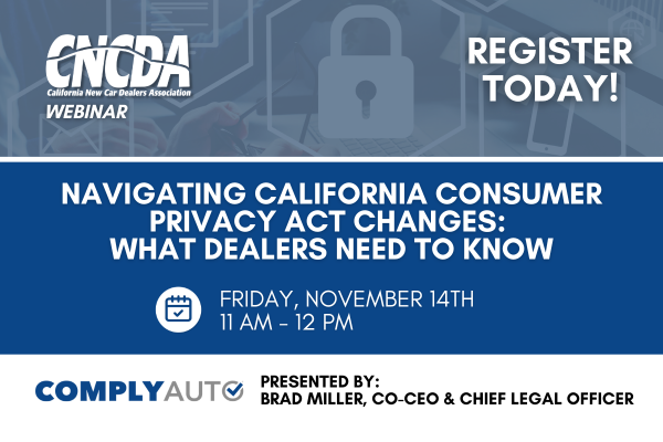 Big changes are coming to the CCPA starting on January 1, 2026. Join CNCDA and ComplyAuto for a focused webinar where we’ll break down the new rules you need to know and the steps your business should take now to stay compliant. While additional updates will roll out later, this session will cut through the noise and zero in on the most important changes taking effect on January 1, 2026—so you’re prepared from day one.