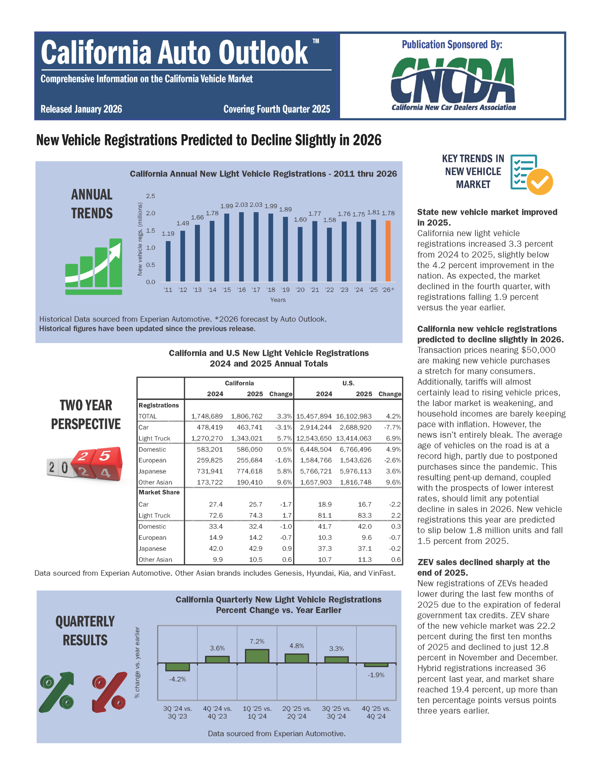 SACRAMENTO, CA (January 22, 2026)—Today, the California New Car Dealers Association (CNCDA) released its Q4 2025 California Auto Outlook report, providing a full-year analysis of statewide new vehicle registration trends. All data in the report is sourced from Experian Automotive and must be cited when referencing these findings.